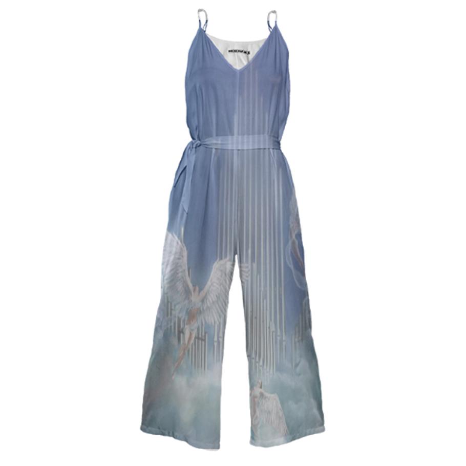 Wide leg jumpsuit with adjustable spaghetti straps invisible side seam zipper and a tie belt.