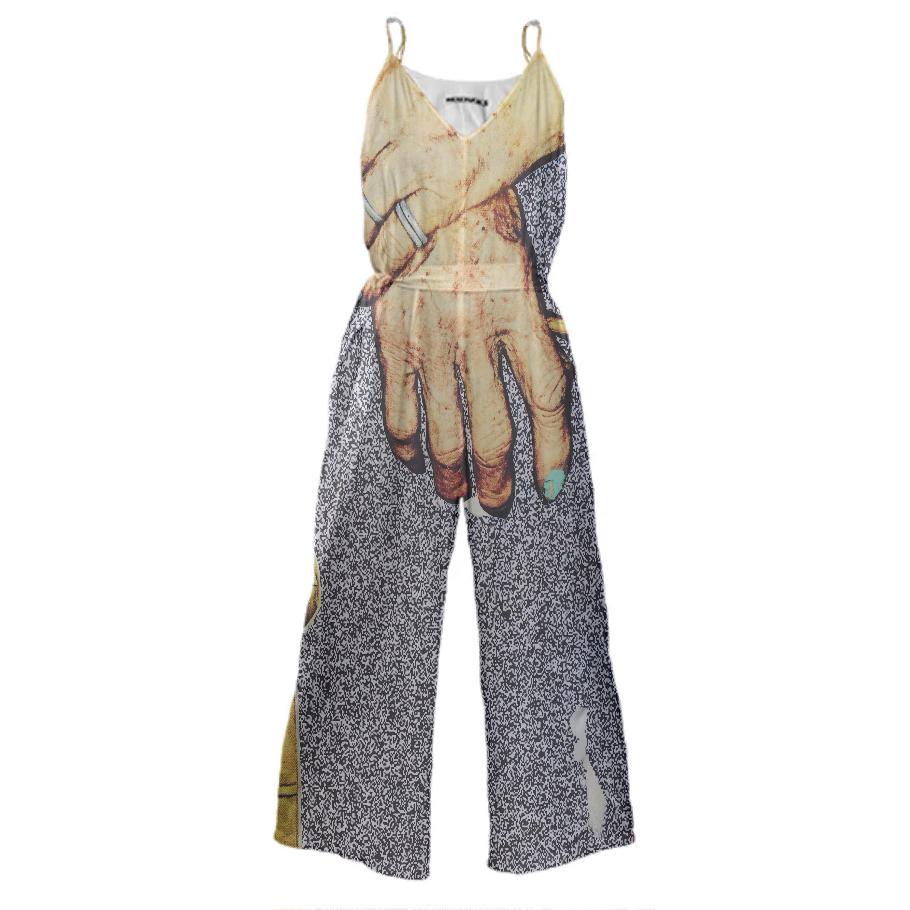 Wide leg jumpsuit with adjustable spaghetti straps invisible side seam zipper and a tie belt.