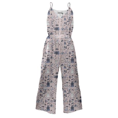 Wide leg jumpsuit with adjustable spaghetti straps invisible side seam zipper and a tie belt.