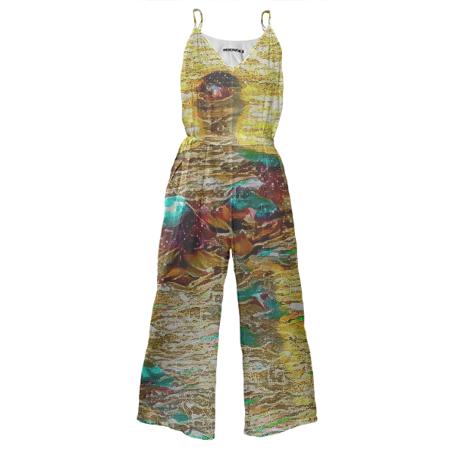 Wide leg jumpsuit with adjustable spaghetti straps invisible side seam zipper and a tie belt.