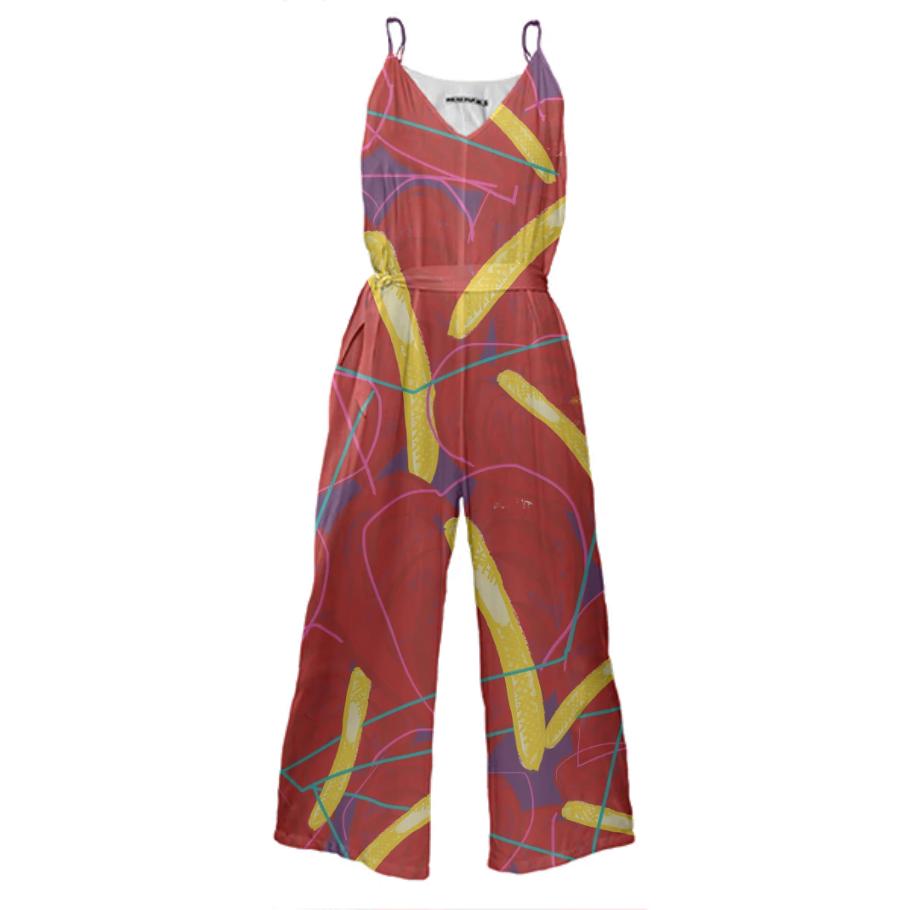 Wide leg jumpsuit with adjustable spaghetti straps invisible side seam zipper and a tie belt.