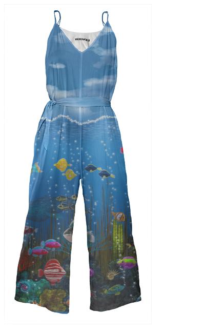 Wide leg jumpsuit with adjustable spaghetti straps invisible side seam zipper and a tie belt.