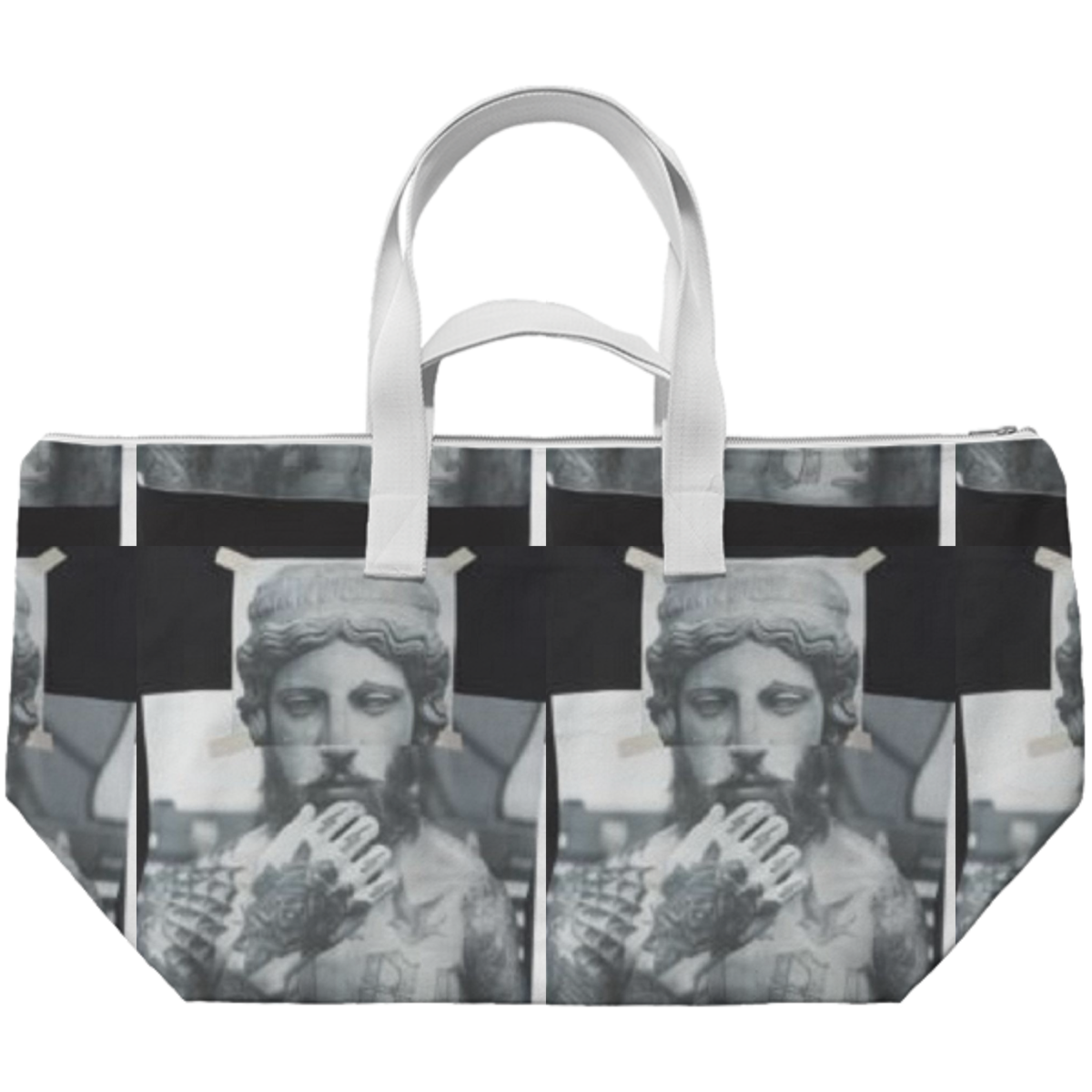 This weekend bag fits all the basics for a short trip. Two lengths of black or white webbing handles makes it easy to carry. Inner zip up pocket ensures easy access to smaller important items.