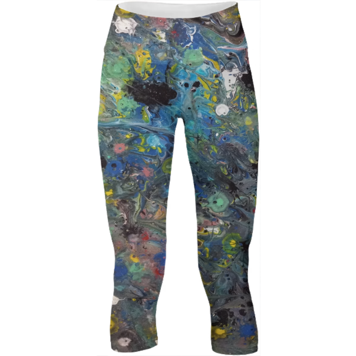 Mid calf length stretch yoga pants with an extra tall waistband for comfort and flexibility during workout.