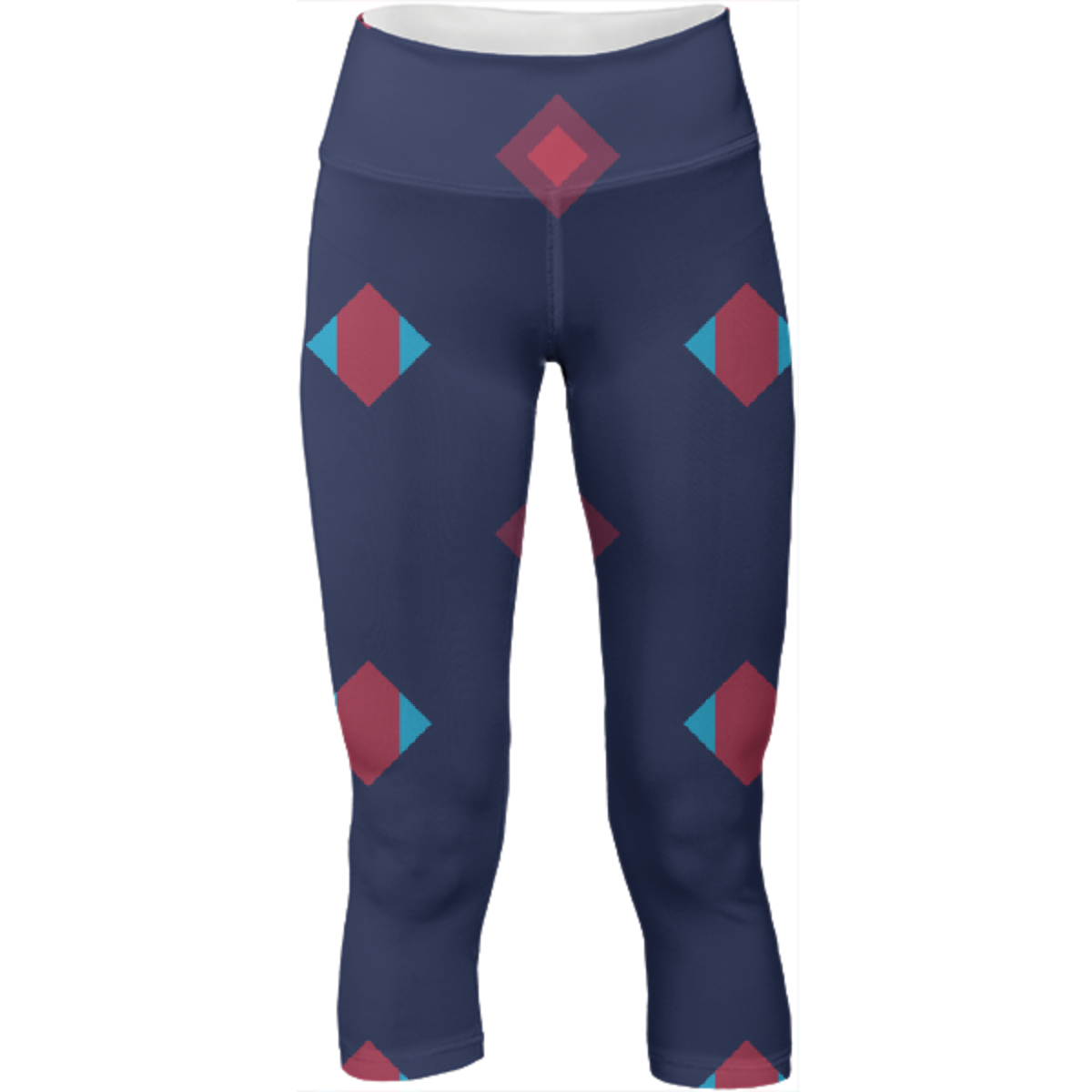 Mid calf length stretch yoga pants with an extra tall waistband for comfort and flexibility during workout.