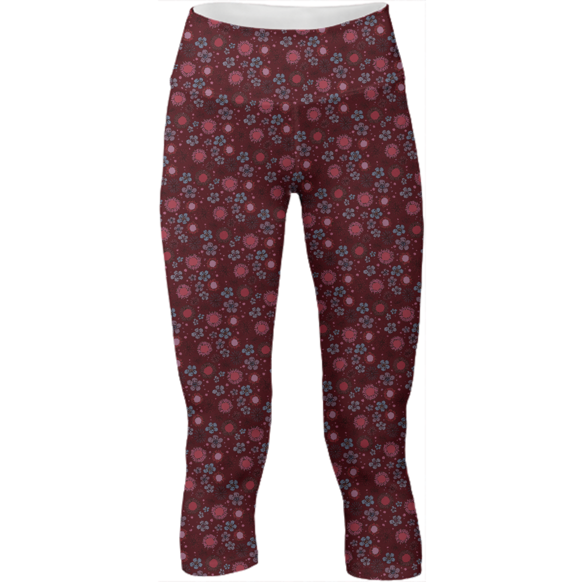 Mid calf length stretch yoga pants with an extra tall waistband for comfort and flexibility during workout.