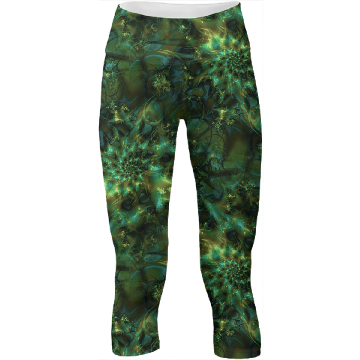 Mid calf length stretch yoga pants with an extra tall waistband for comfort and flexibility during workout.