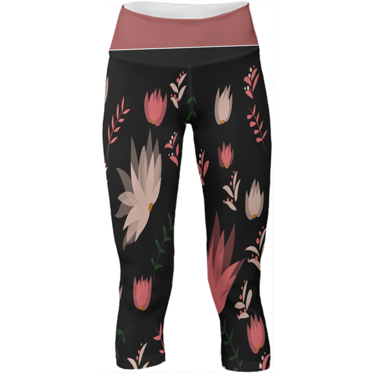 Mid calf length stretch yoga pants with an extra tall waistband for comfort and flexibility during workout.