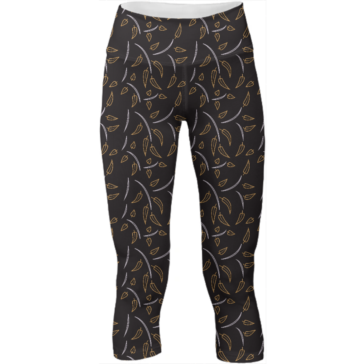 Mid calf length stretch yoga pants with an extra tall waistband for comfort and flexibility during workout.