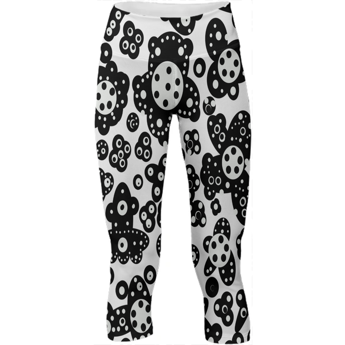 Mid calf length stretch yoga pants with an extra tall waistband for comfort and flexibility during workout.