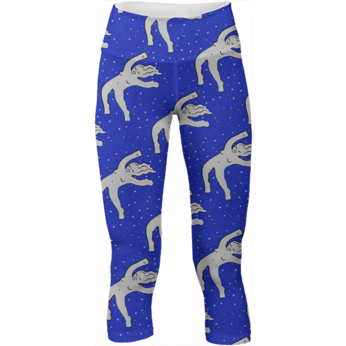 Mid calf length stretch yoga pants with an extra tall waistband for comfort and flexibility during workout.