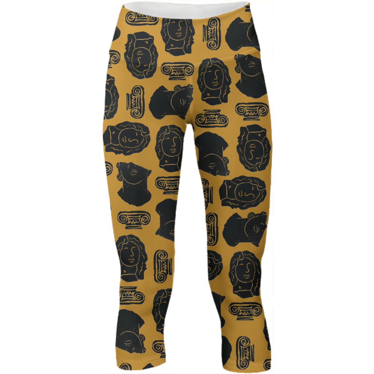 Mid calf length stretch yoga pants with an extra tall waistband for comfort and flexibility during workout.