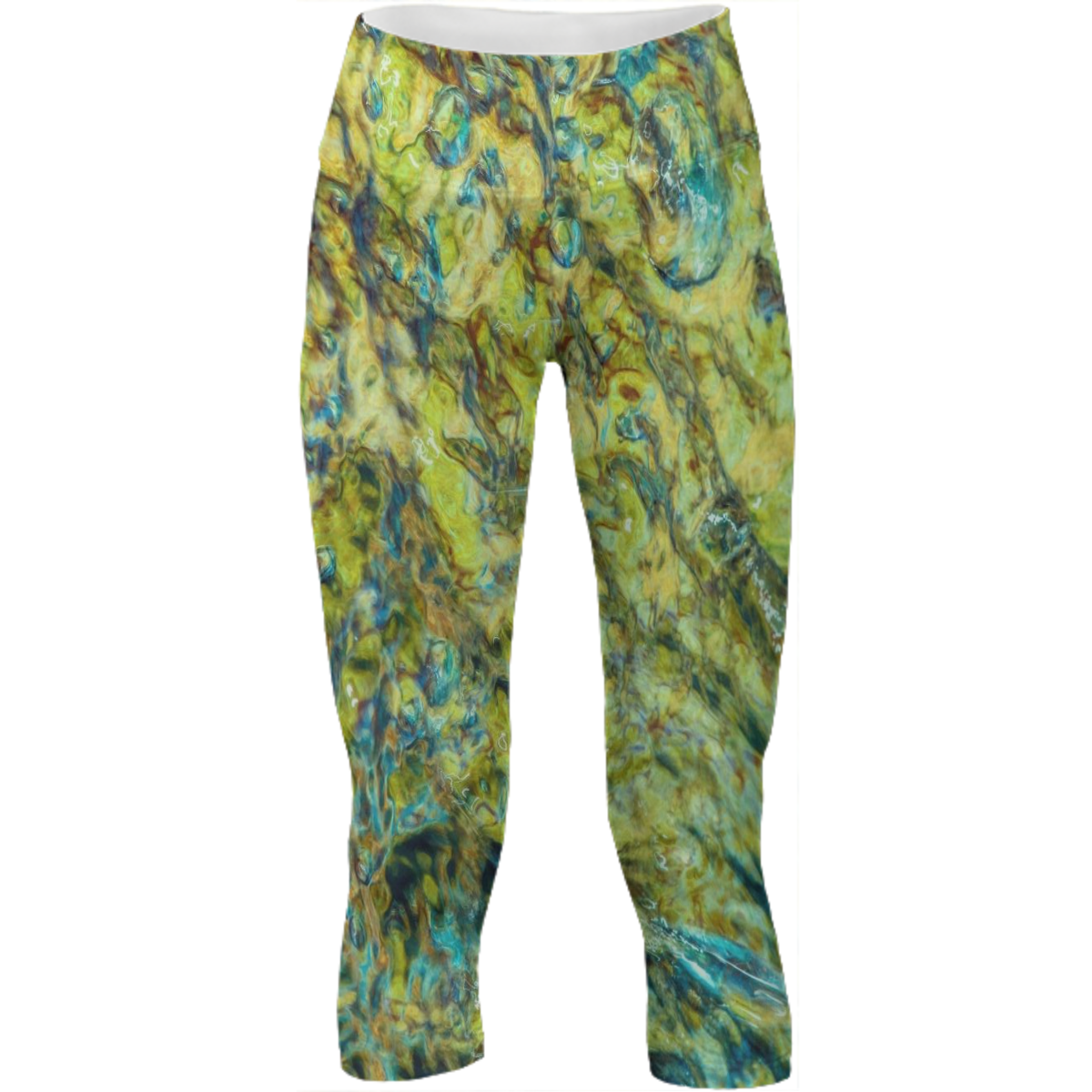 Mid calf length stretch yoga pants with an extra tall waistband for comfort and flexibility during workout.