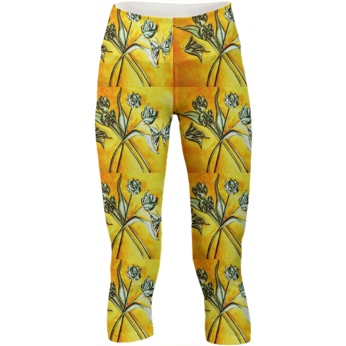 Mid calf length stretch yoga pants with an extra tall waistband for comfort and flexibility during workout.