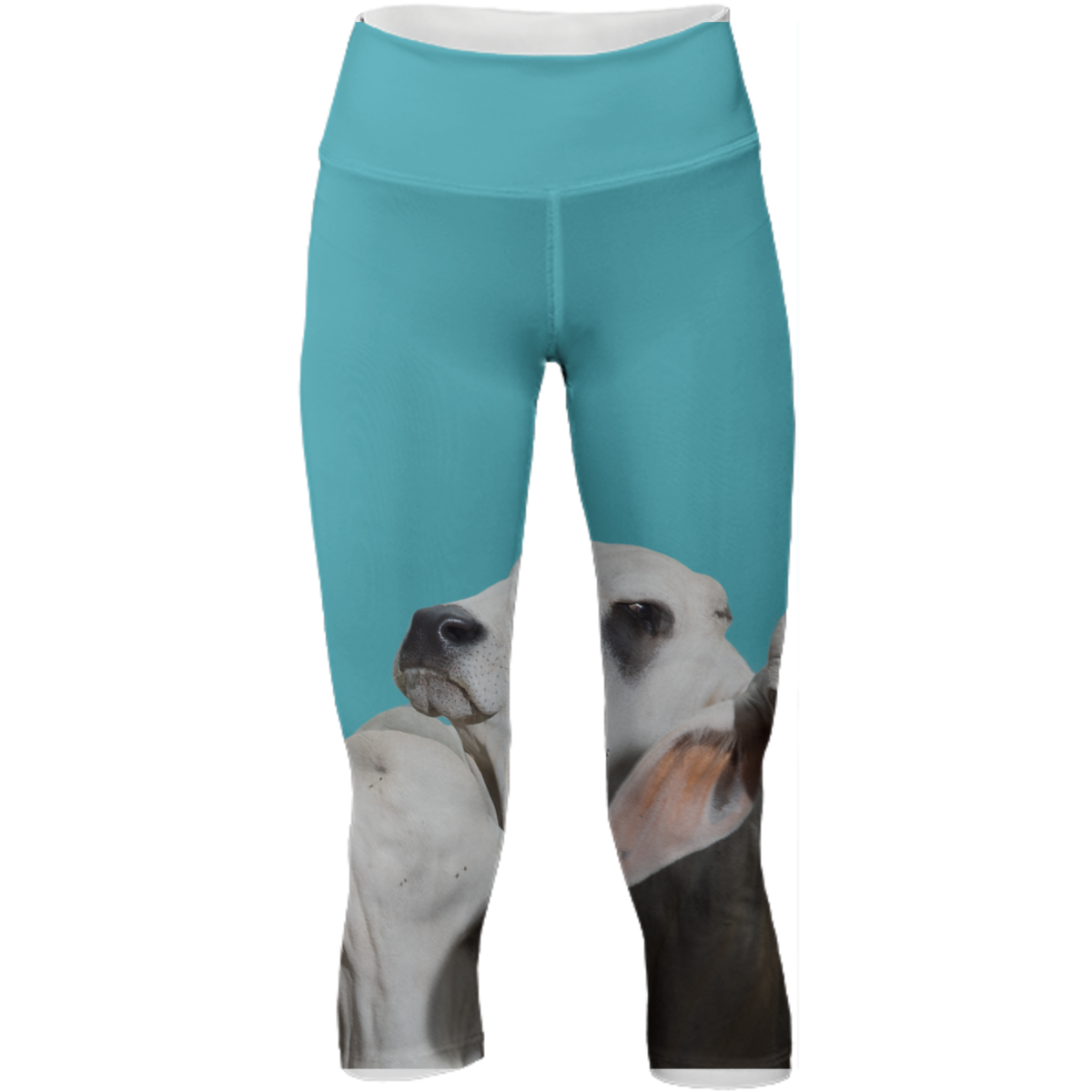 Mid calf length stretch yoga pants with an extra tall waistband for comfort and flexibility during workout.