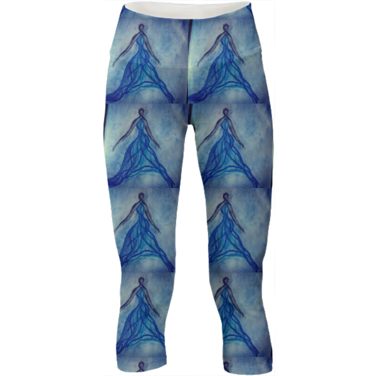 Mid calf length stretch yoga pants with an extra tall waistband for comfort and flexibility during workout.