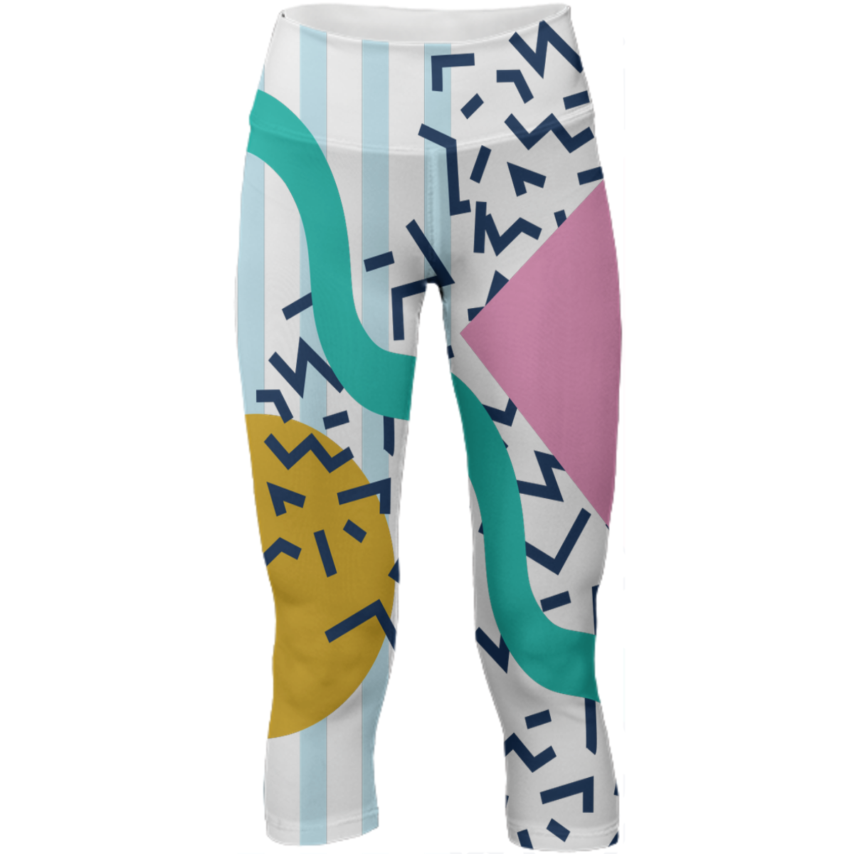 Mid calf length stretch yoga pants with an extra tall waistband for comfort and flexibility during workout.