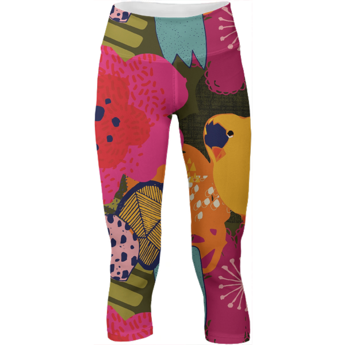 Mid calf length stretch yoga pants with an extra tall waistband for comfort and flexibility during workout.