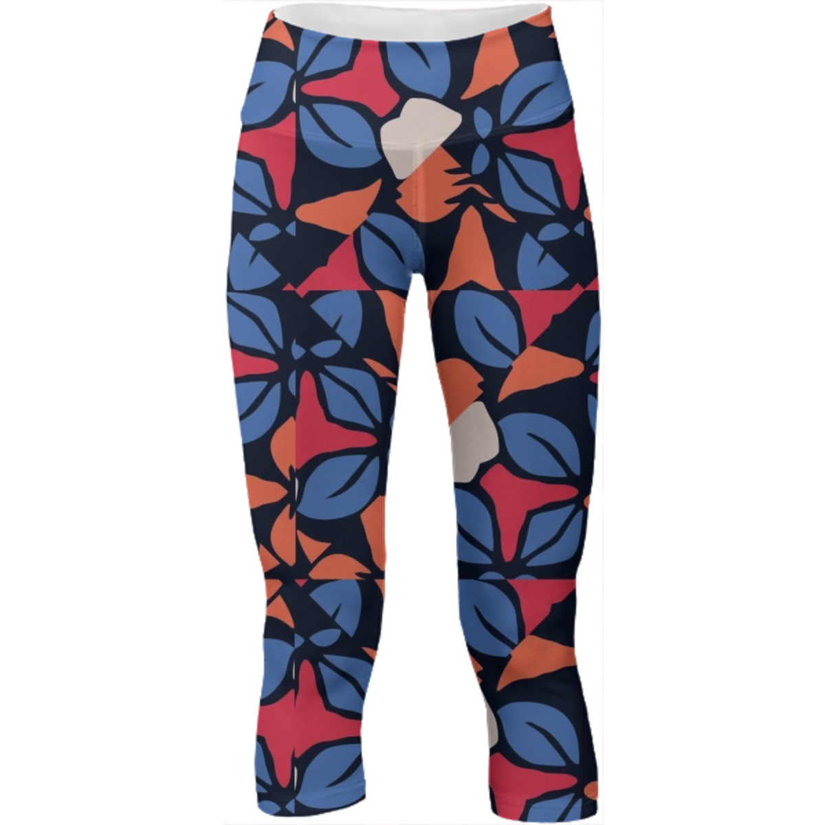 Mid calf length stretch yoga pants with an extra tall waistband for comfort and flexibility during workout.
