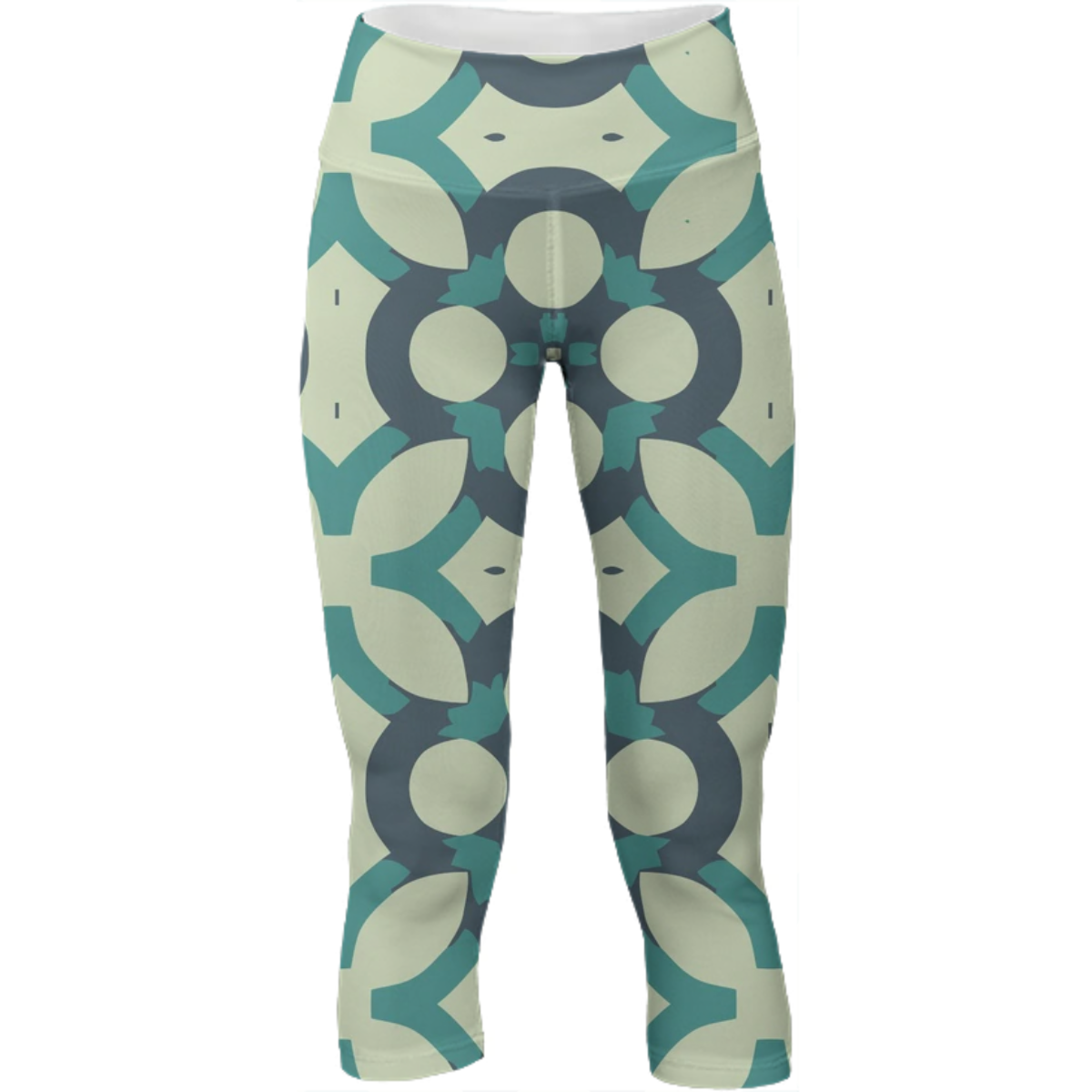 Mid calf length stretch yoga pants with an extra tall waistband for comfort and flexibility during workout.