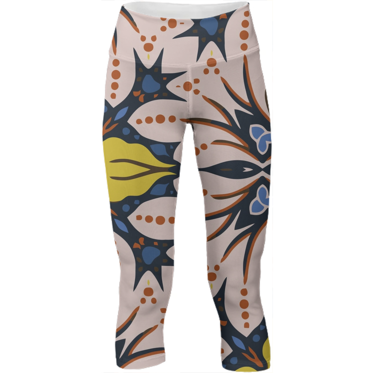 Mid calf length stretch yoga pants with an extra tall waistband for comfort and flexibility during workout.