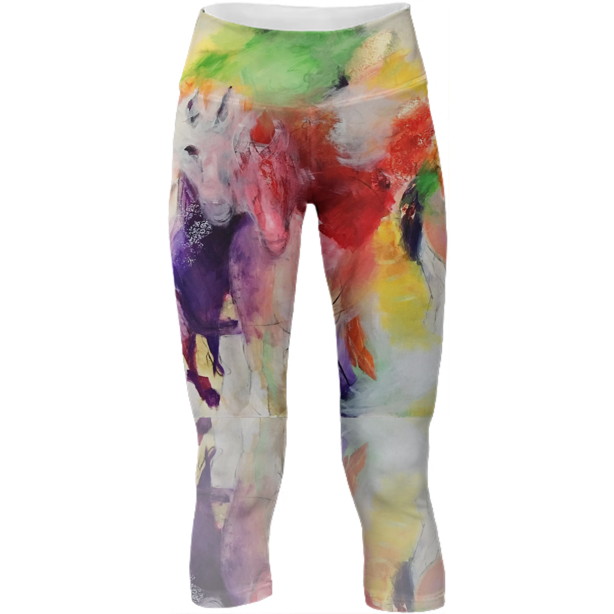 Mid calf length stretch yoga pants with an extra tall waistband for comfort and flexibility during workout.