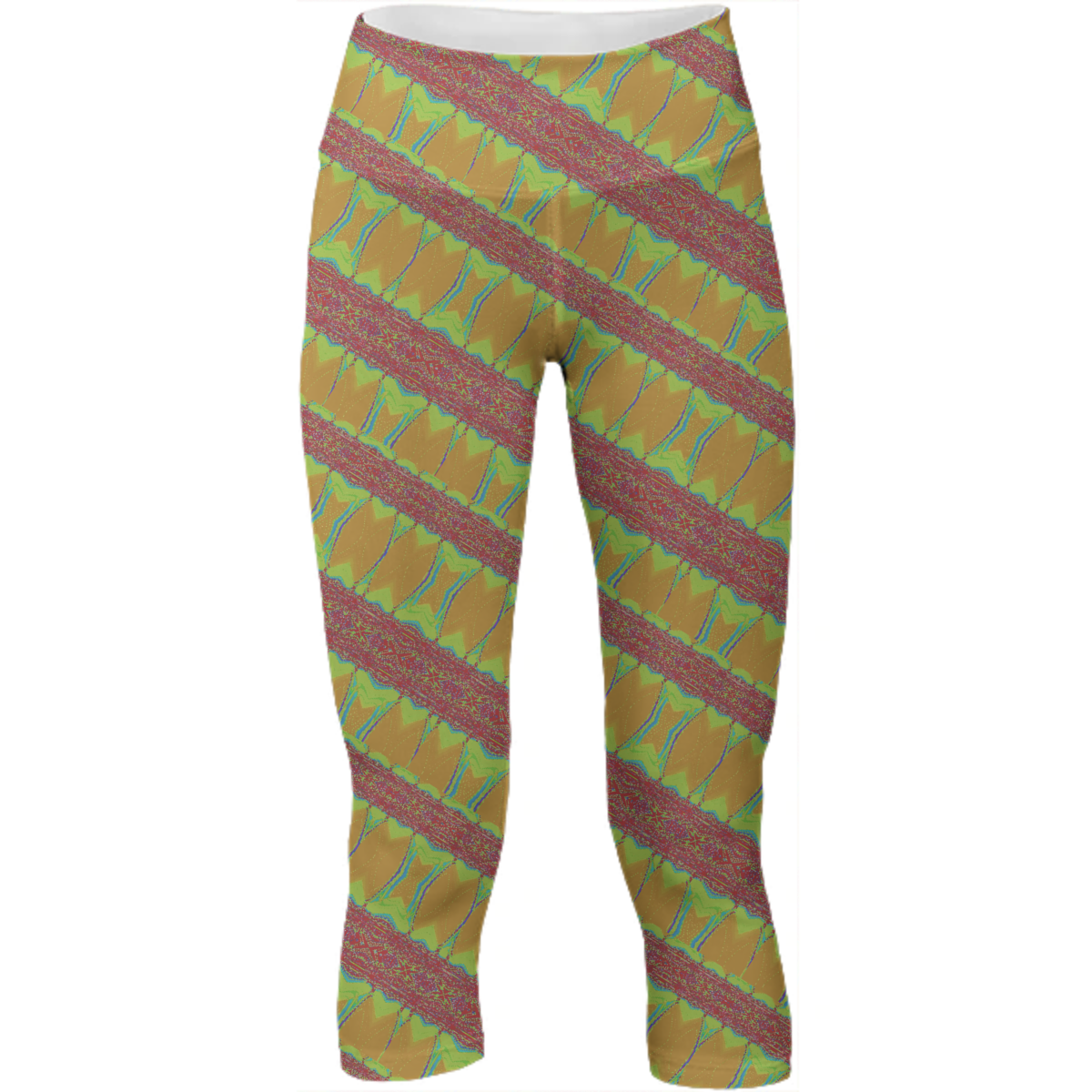 Mid calf length stretch yoga pants with an extra tall waistband for comfort and flexibility during workout.