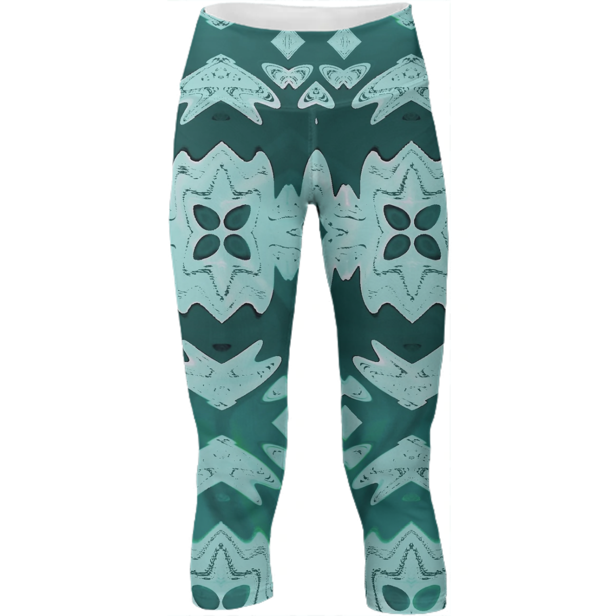 Mid calf length stretch yoga pants with an extra tall waistband for comfort and flexibility during workout.
