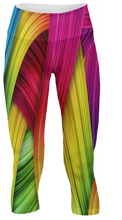 Mid calf length stretch yoga pants with an extra tall waistband for comfort and flexibility during workout.