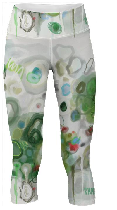 Mid calf length stretch yoga pants with an extra tall waistband for comfort and flexibility during workout.