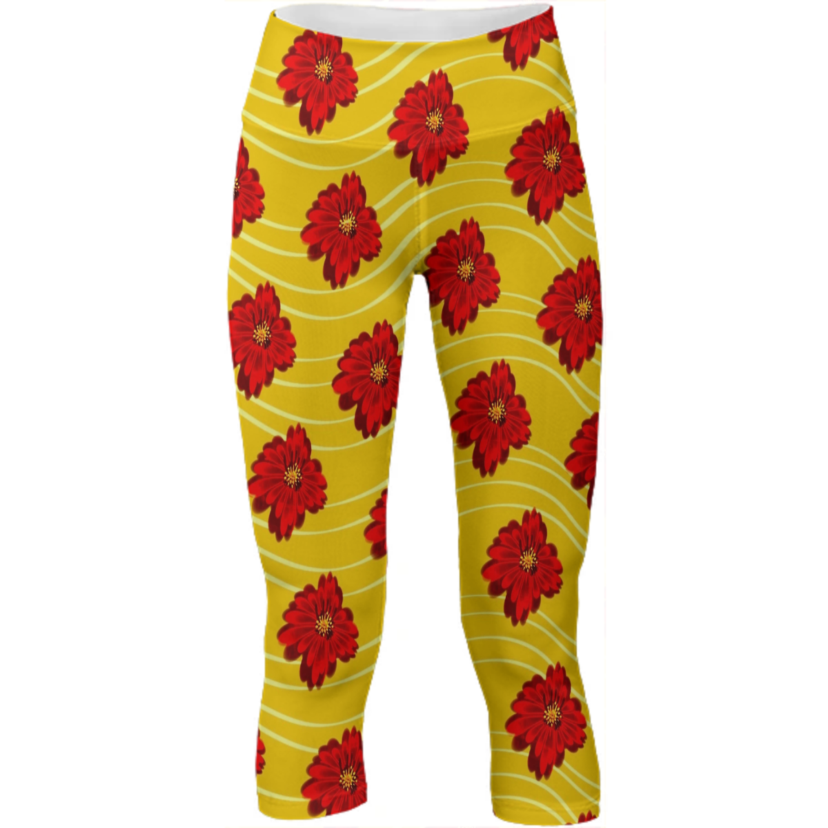 Mid calf length stretch yoga pants with an extra tall waistband for comfort and flexibility during workout.