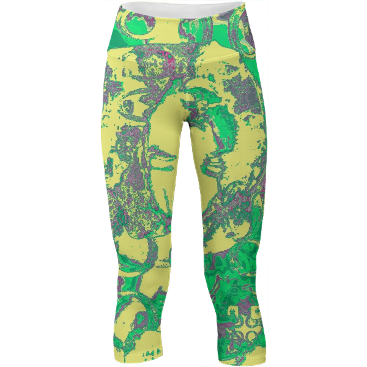 Mid calf length stretch yoga pants with an extra tall waistband for comfort and flexibility during workout.