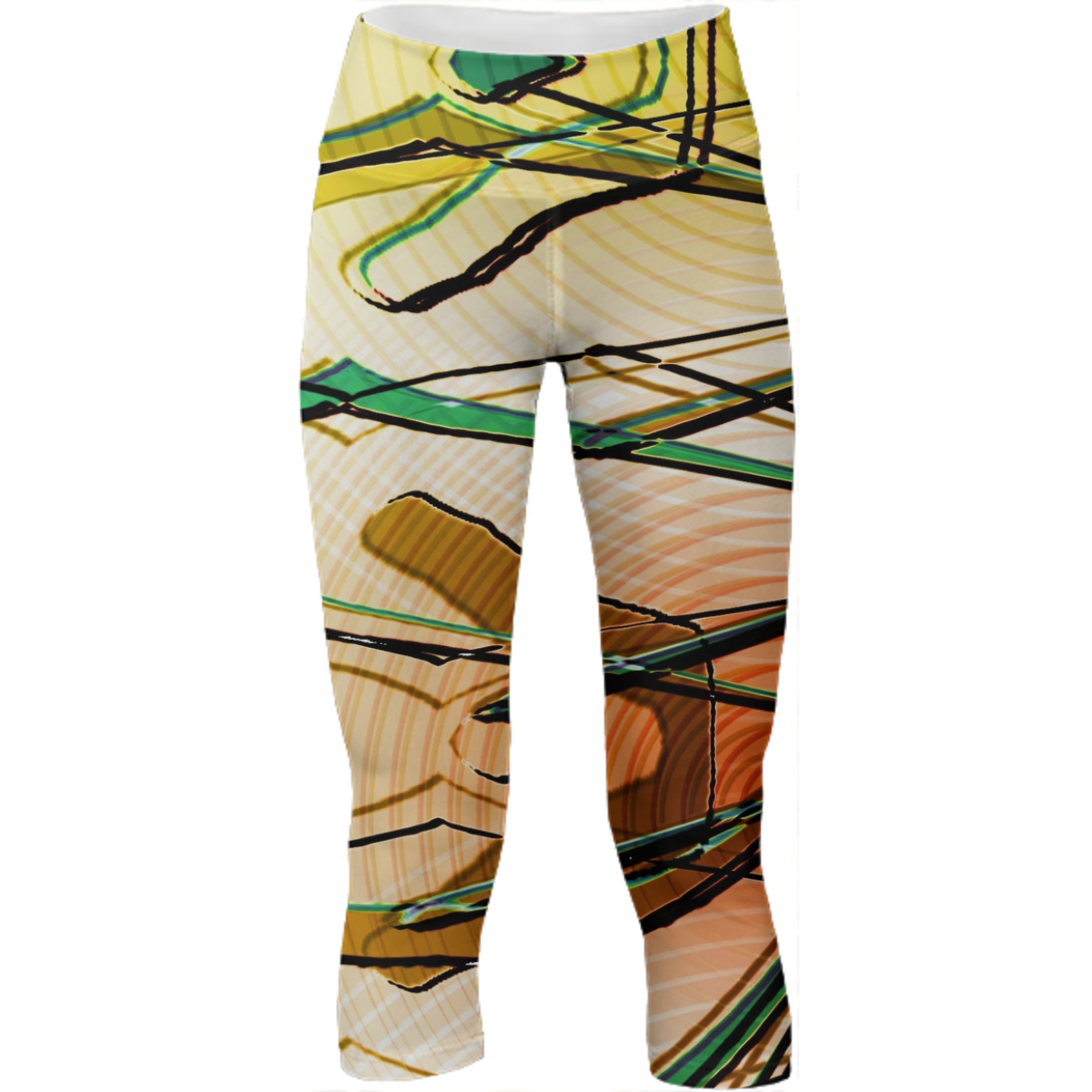 Mid calf length stretch yoga pants with an extra tall waistband for comfort and flexibility during workout.