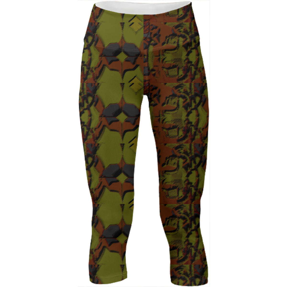 Mid calf length stretch yoga pants with an extra tall waistband for comfort and flexibility during workout.