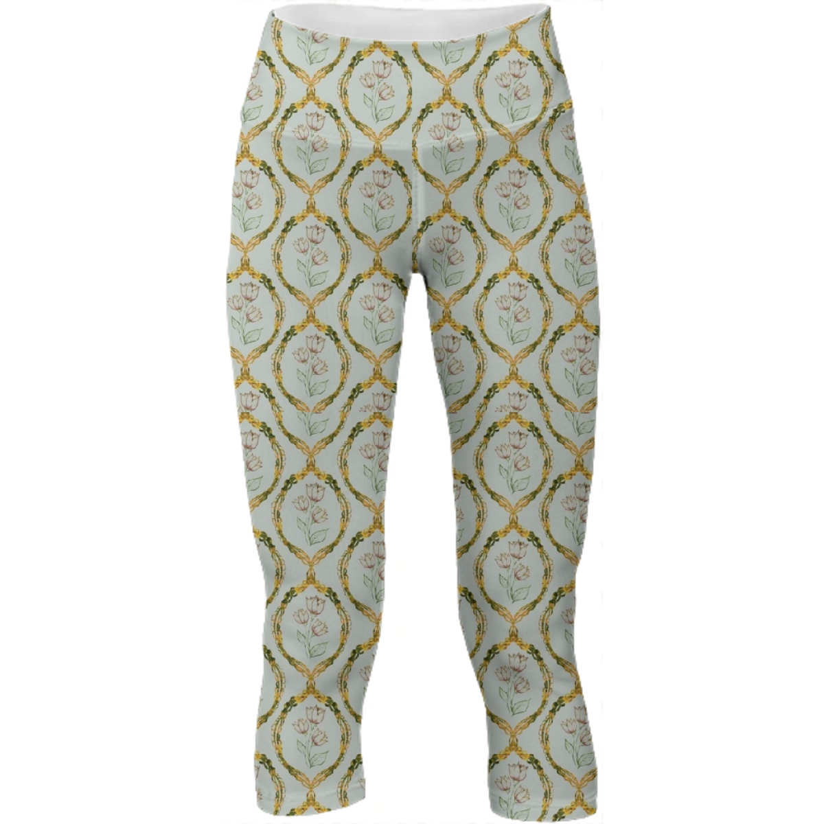 Mid calf length stretch yoga pants with an extra tall waistband for comfort and flexibility during workout.