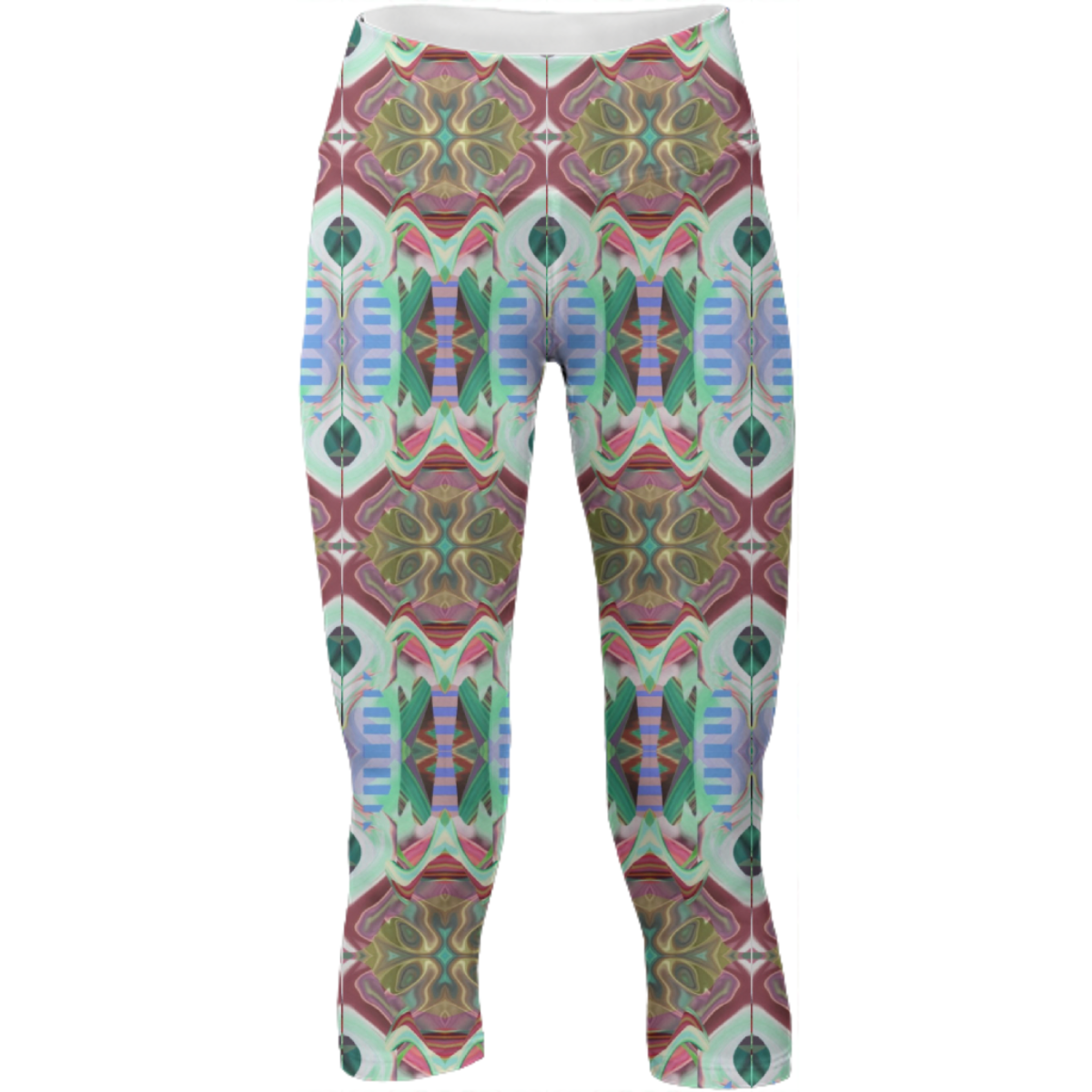 Mid calf length stretch yoga pants with an extra tall waistband for comfort and flexibility during workout.