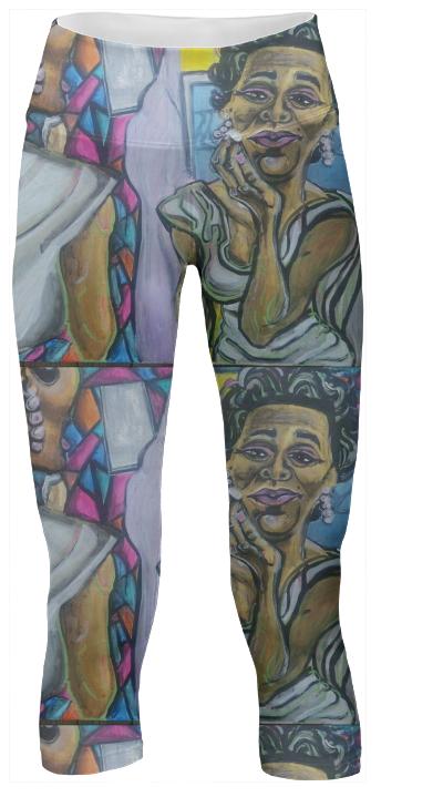 Mid calf length stretch yoga pants with an extra tall waistband for comfort and flexibility during workout.