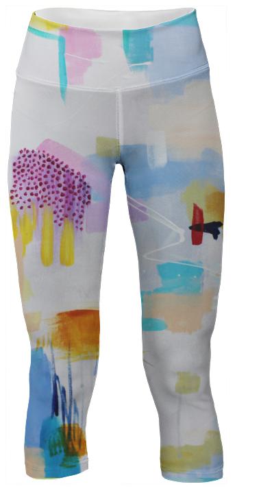 Mid calf length stretch yoga pants with an extra tall waistband for comfort and flexibility during workout.