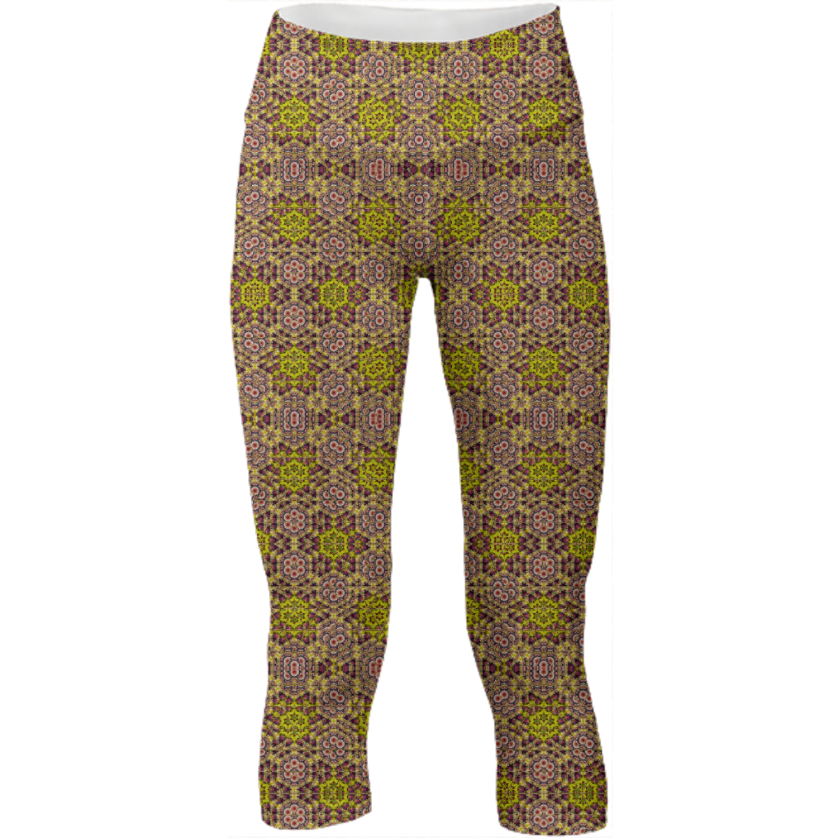 Mid calf length stretch yoga pants with an extra tall waistband for comfort and flexibility during workout.