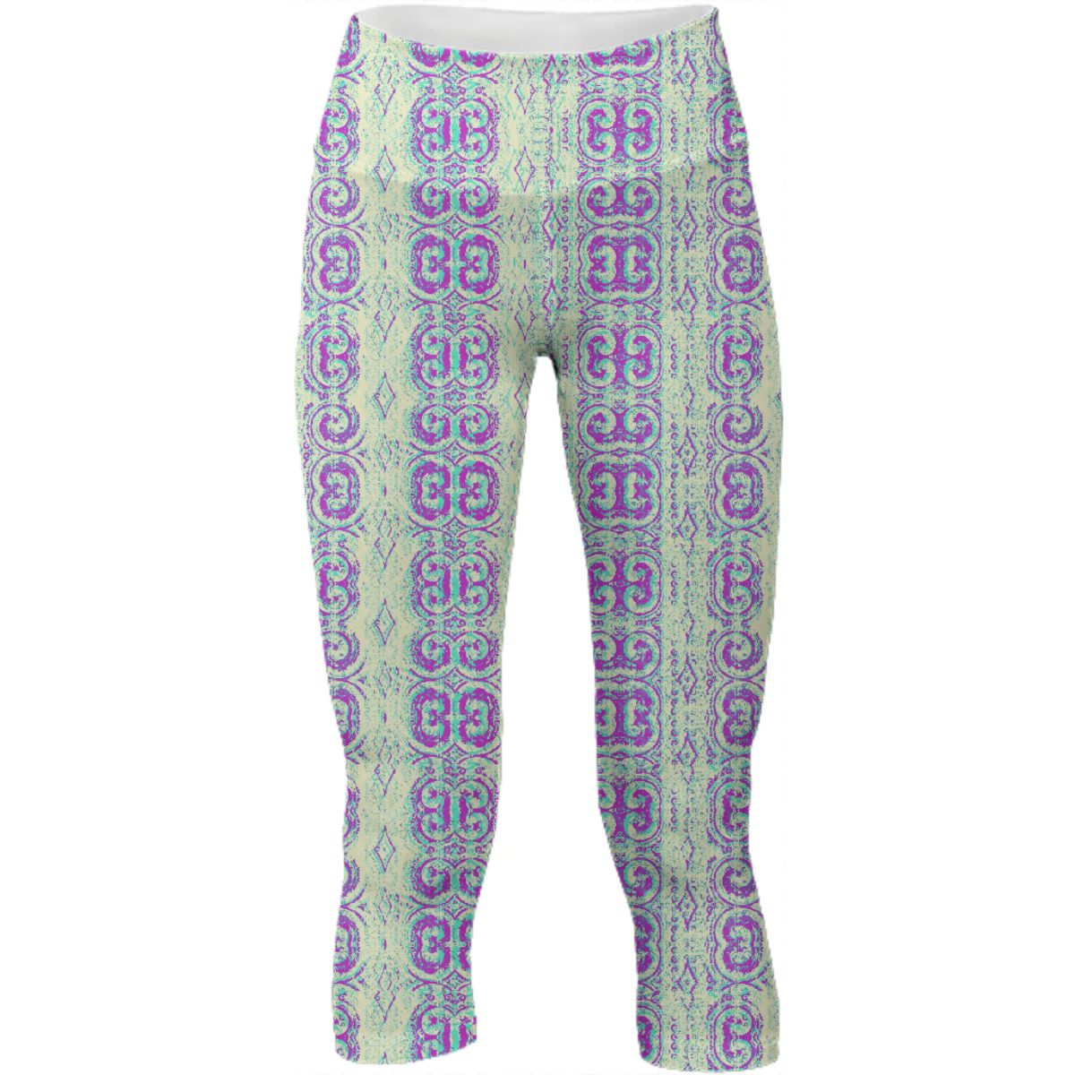 Mid calf length stretch yoga pants with an extra tall waistband for comfort and flexibility during workout.