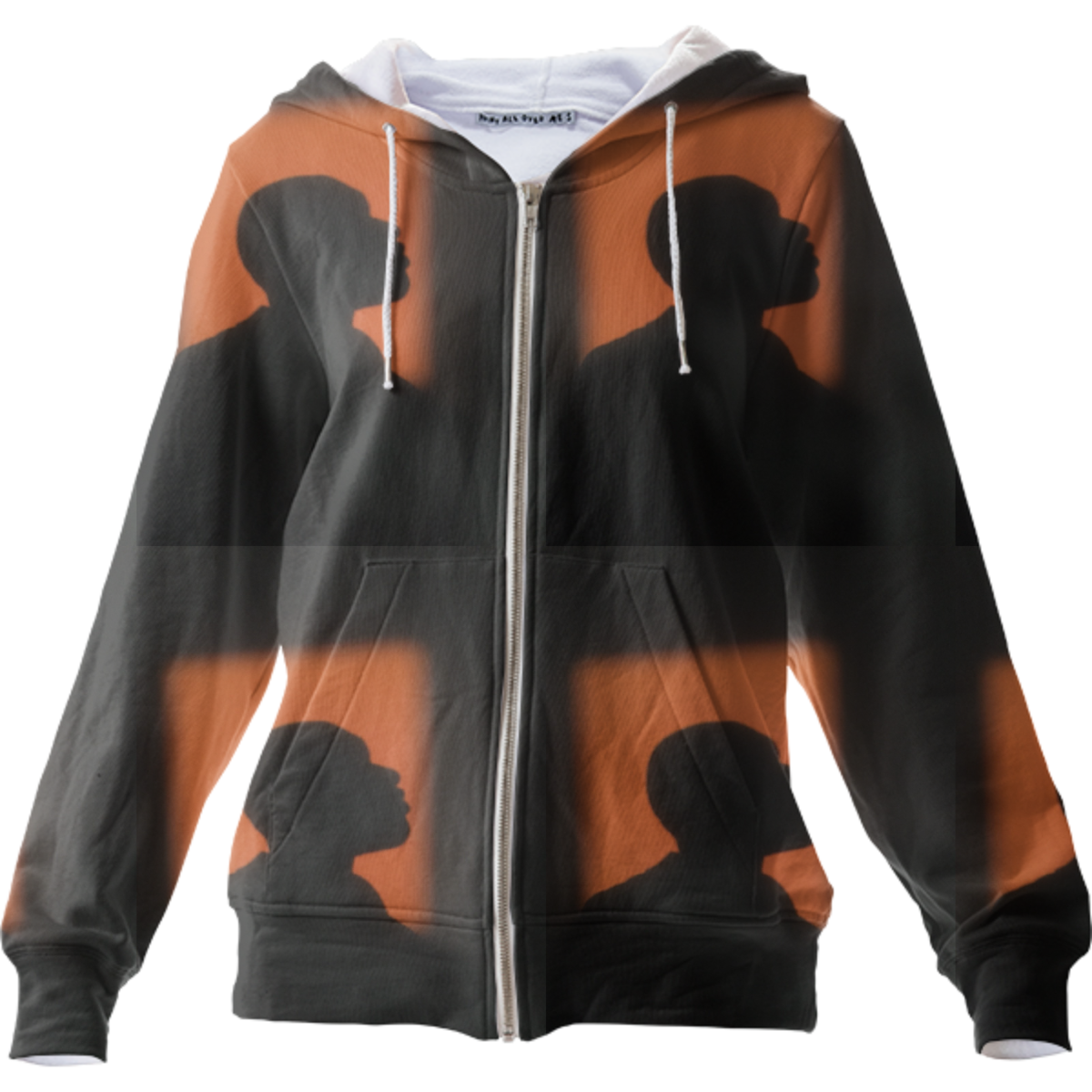 Slim fitting zip up hoodie with front kangaroo pockets metal zipper and drawstring hood.