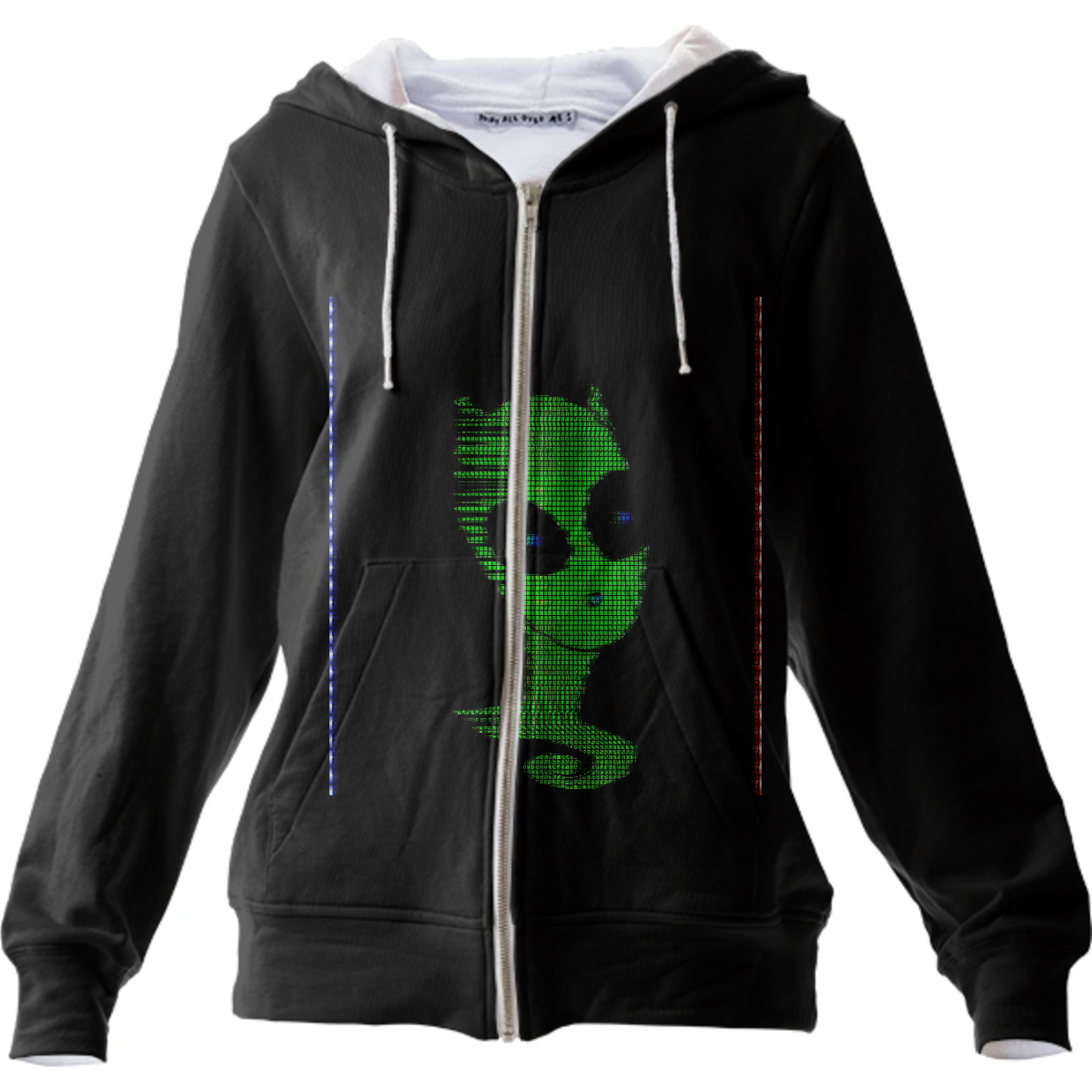 Slim fitting zip up hoodie with front kangaroo pockets metal zipper and drawstring hood.