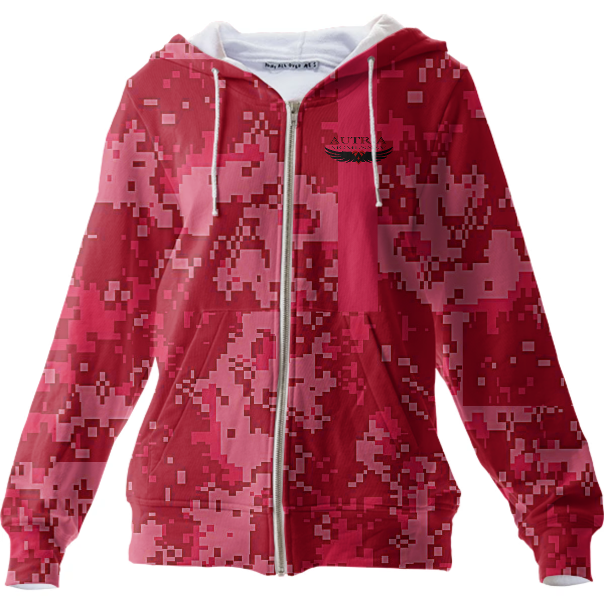 Slim fitting zip up hoodie with front kangaroo pockets metal zipper and drawstring hood.