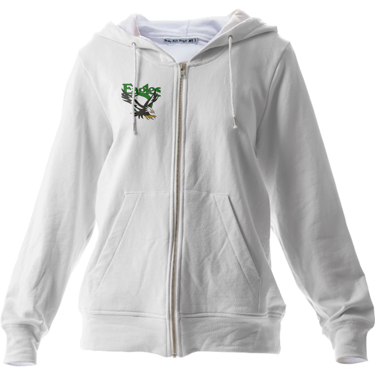 Slim fitting zip up hoodie with front kangaroo pockets metal zipper and drawstring hood.