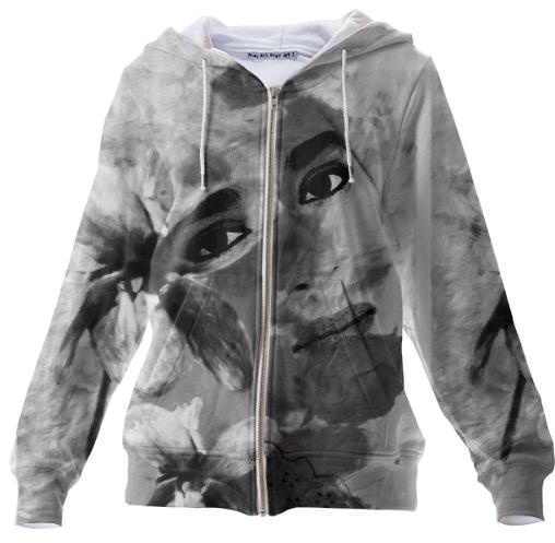 Slim fitting zip up hoodie with front kangaroo pockets metal zipper and drawstring hood.