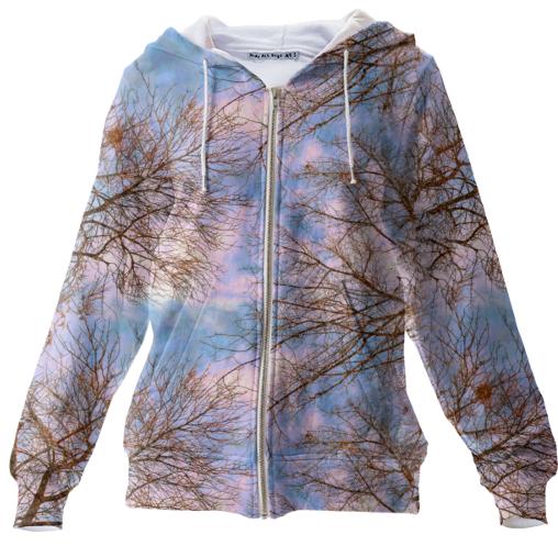 Slim fitting zip up hoodie with front kangaroo pockets metal zipper and drawstring hood.