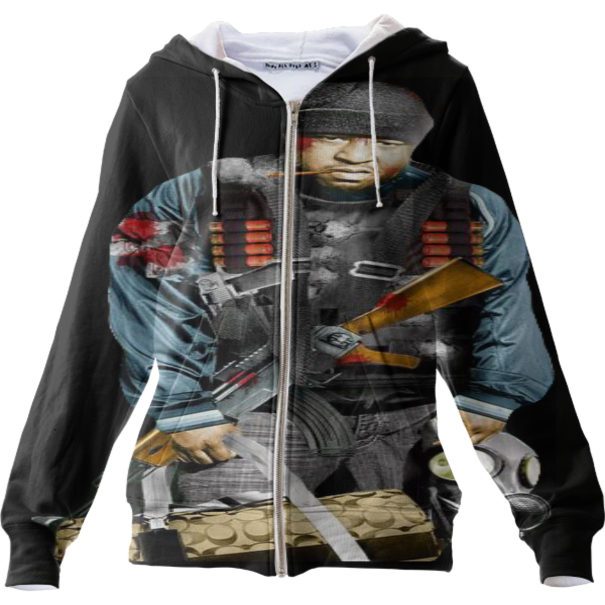 Slim fitting zip up hoodie with front kangaroo pockets metal zipper and drawstring hood.