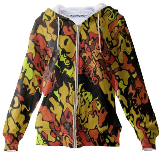 Slim fitting zip up hoodie with front kangaroo pockets metal zipper and drawstring hood.
