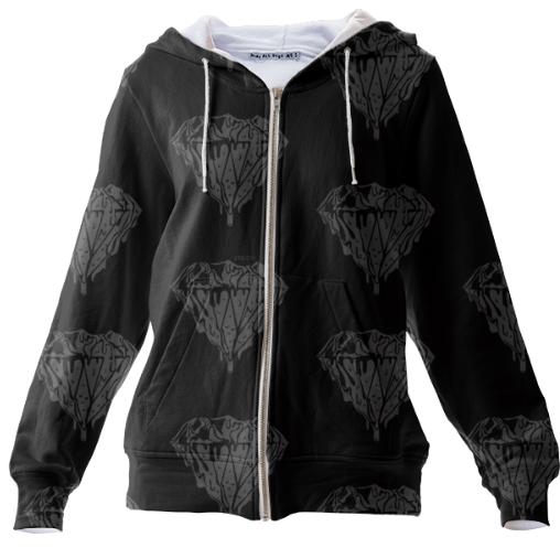 Slim fitting zip up hoodie with front kangaroo pockets metal zipper and drawstring hood.