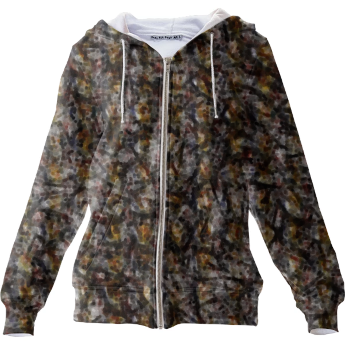 Slim fitting zip up hoodie with front kangaroo pockets metal zipper and drawstring hood.